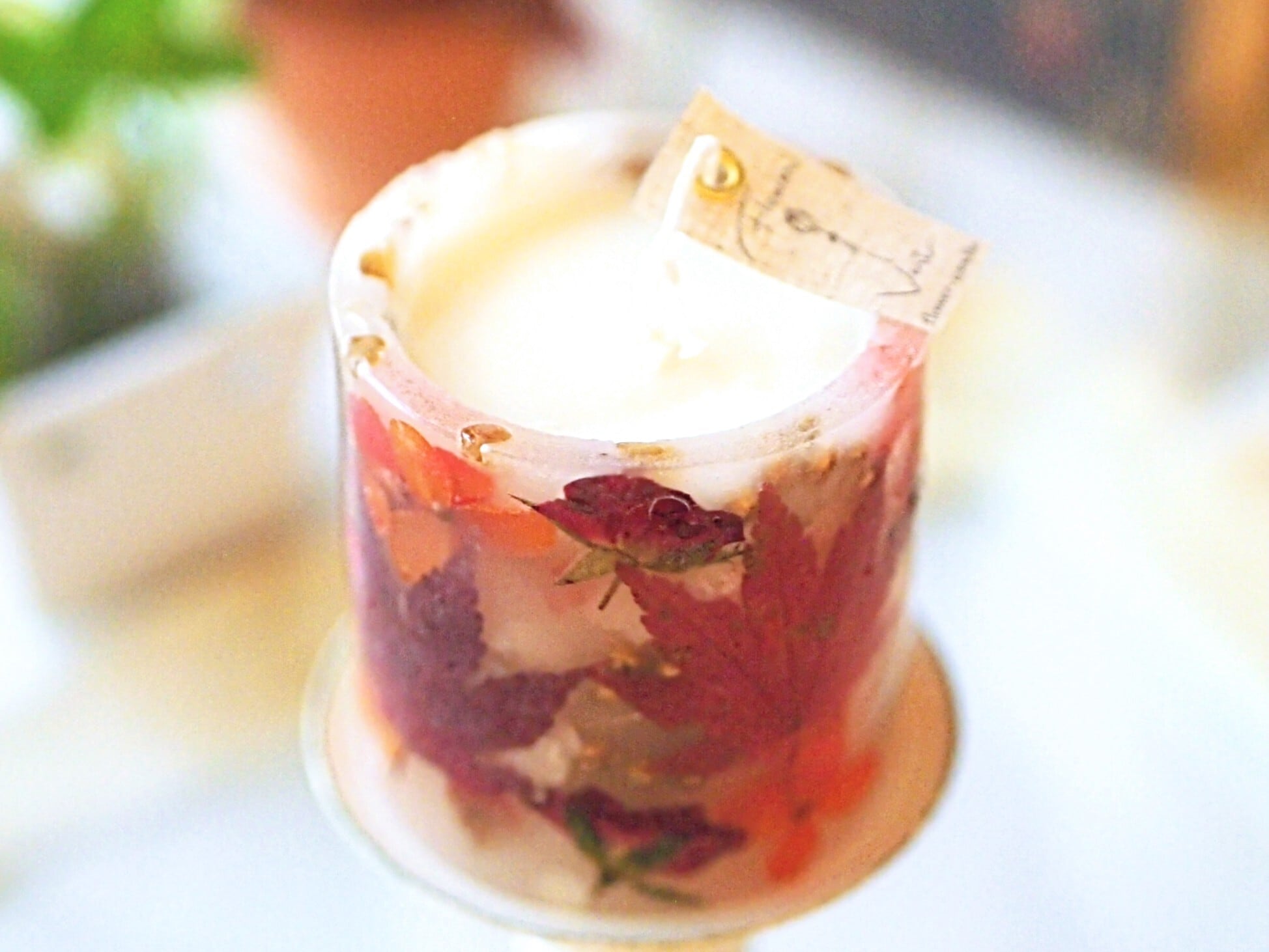 紅葉をメインに、ミニバラなどをつかった、ボタニカルアロマキャンドルです。