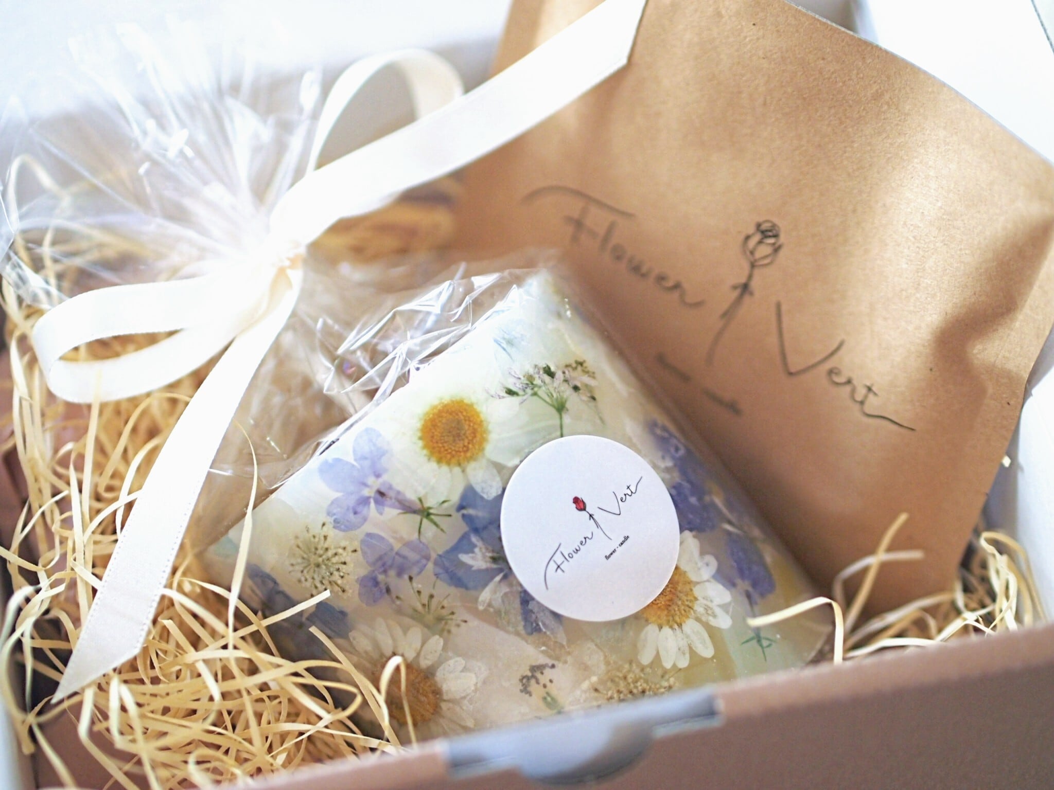 有料ラッピング、オリジナルピンクバスソルト付き(シャンパンピンクBOX・パステルアートのシール、紙袋付き)